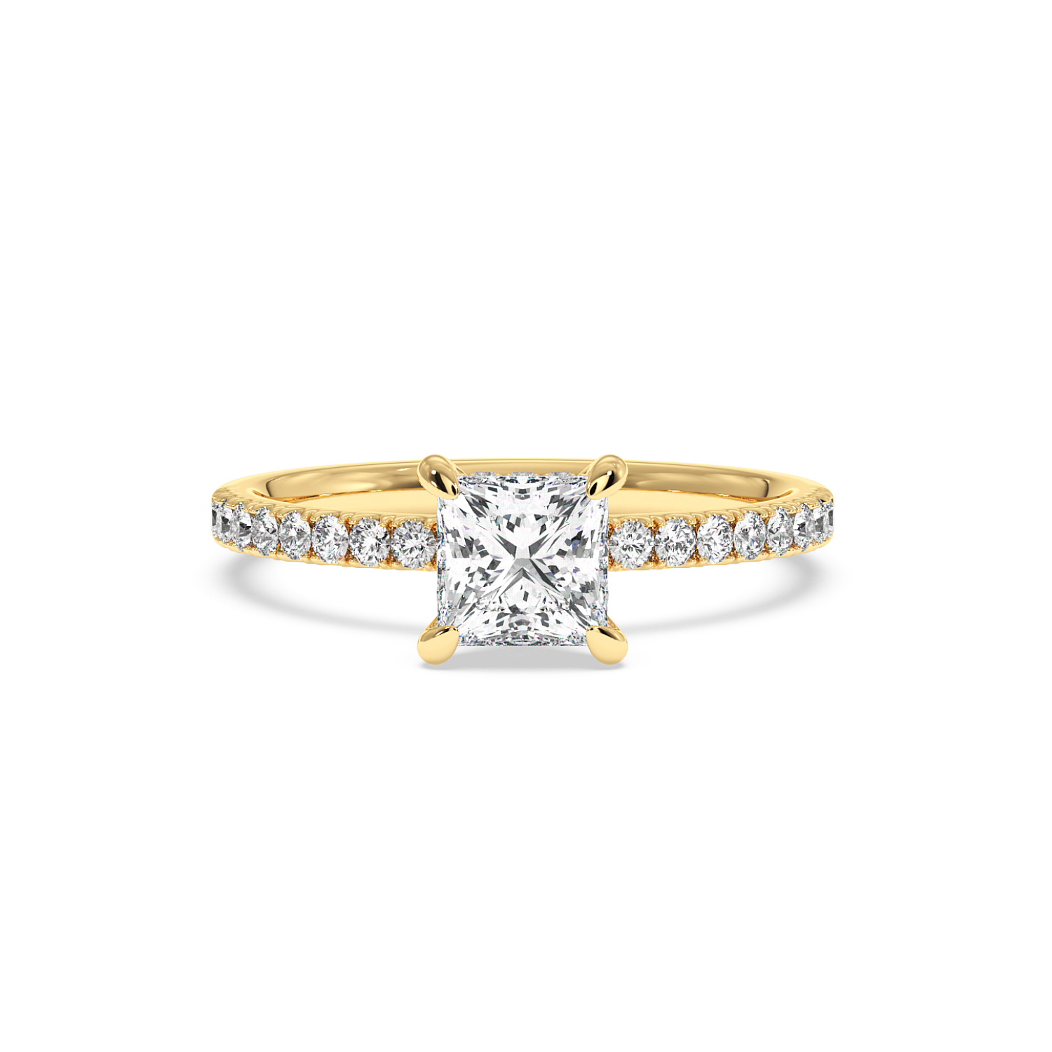 Four Claw Princess Cut Ring with Hidden Halo & Side Diamonds