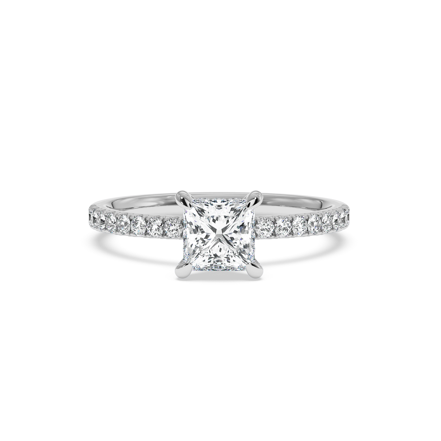 Four Claw Princess Cut Ring with Hidden Halo & Side Diamonds