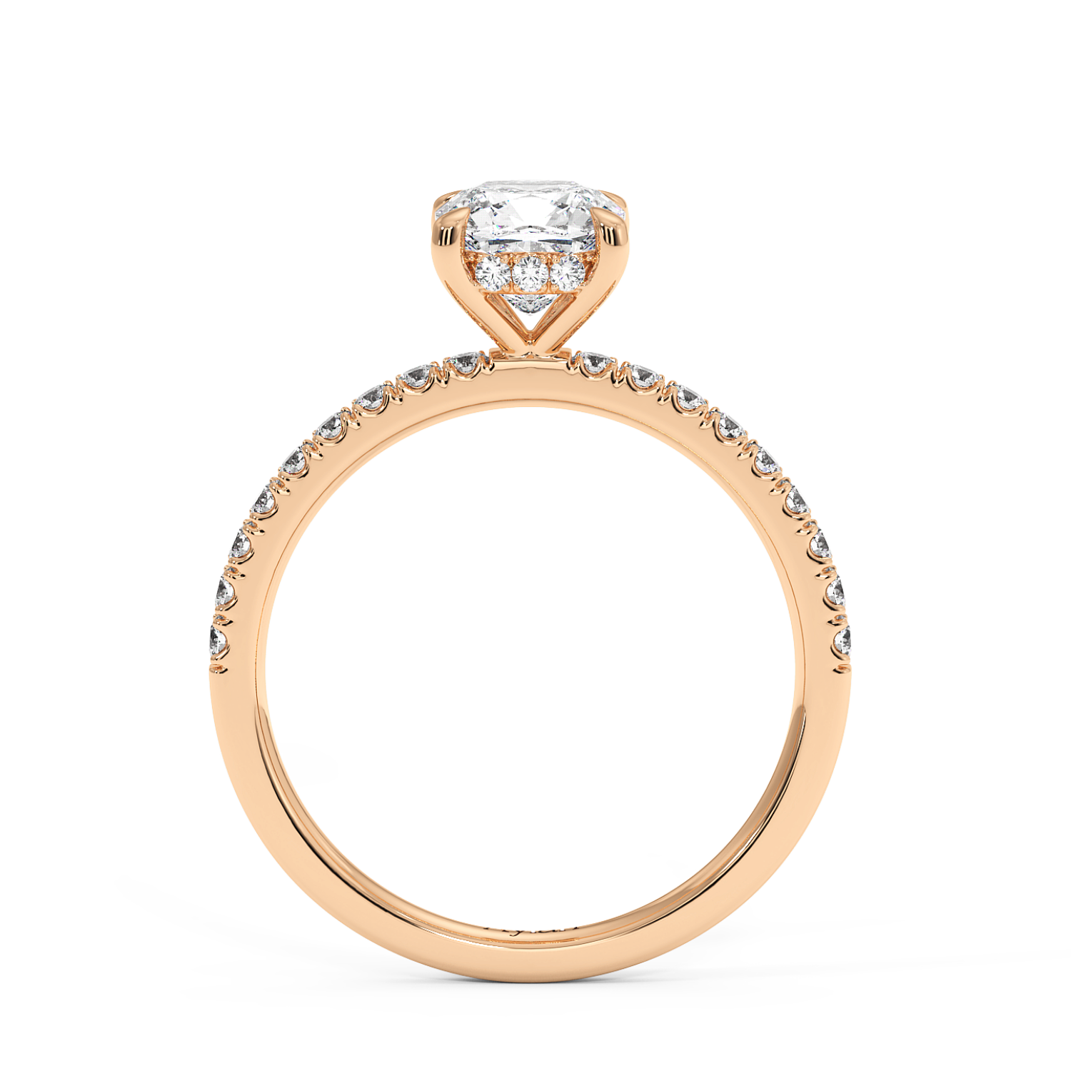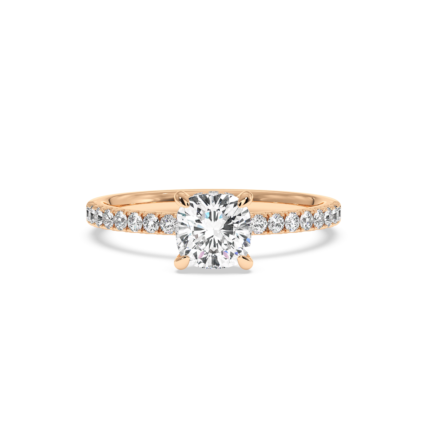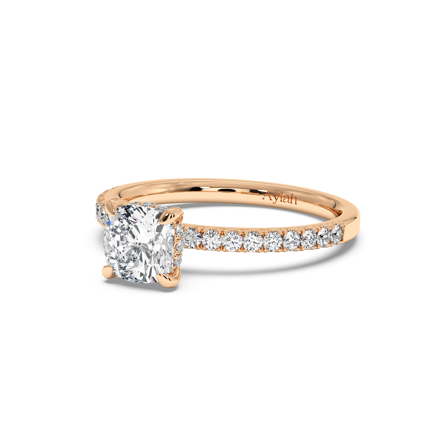 Four Claw Cushion Cut Ring with Hidden Halo & Side Diamonds