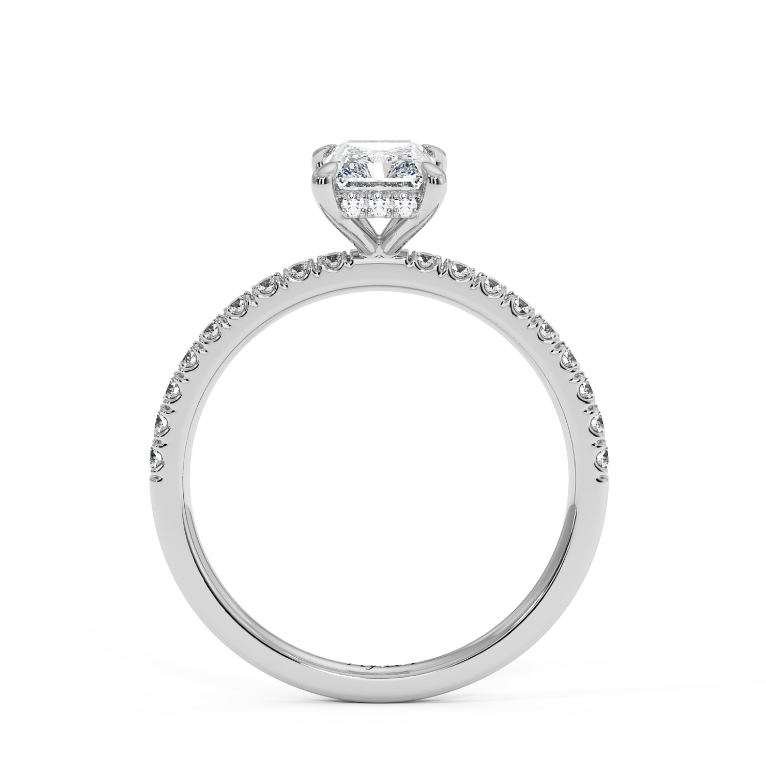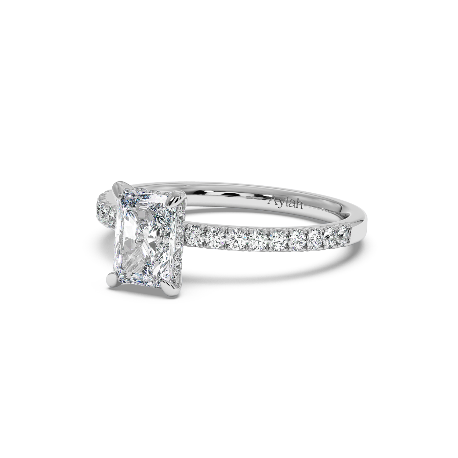 Four Claw Radiant Cut Ring with Hidden Halo & Side Diamonds