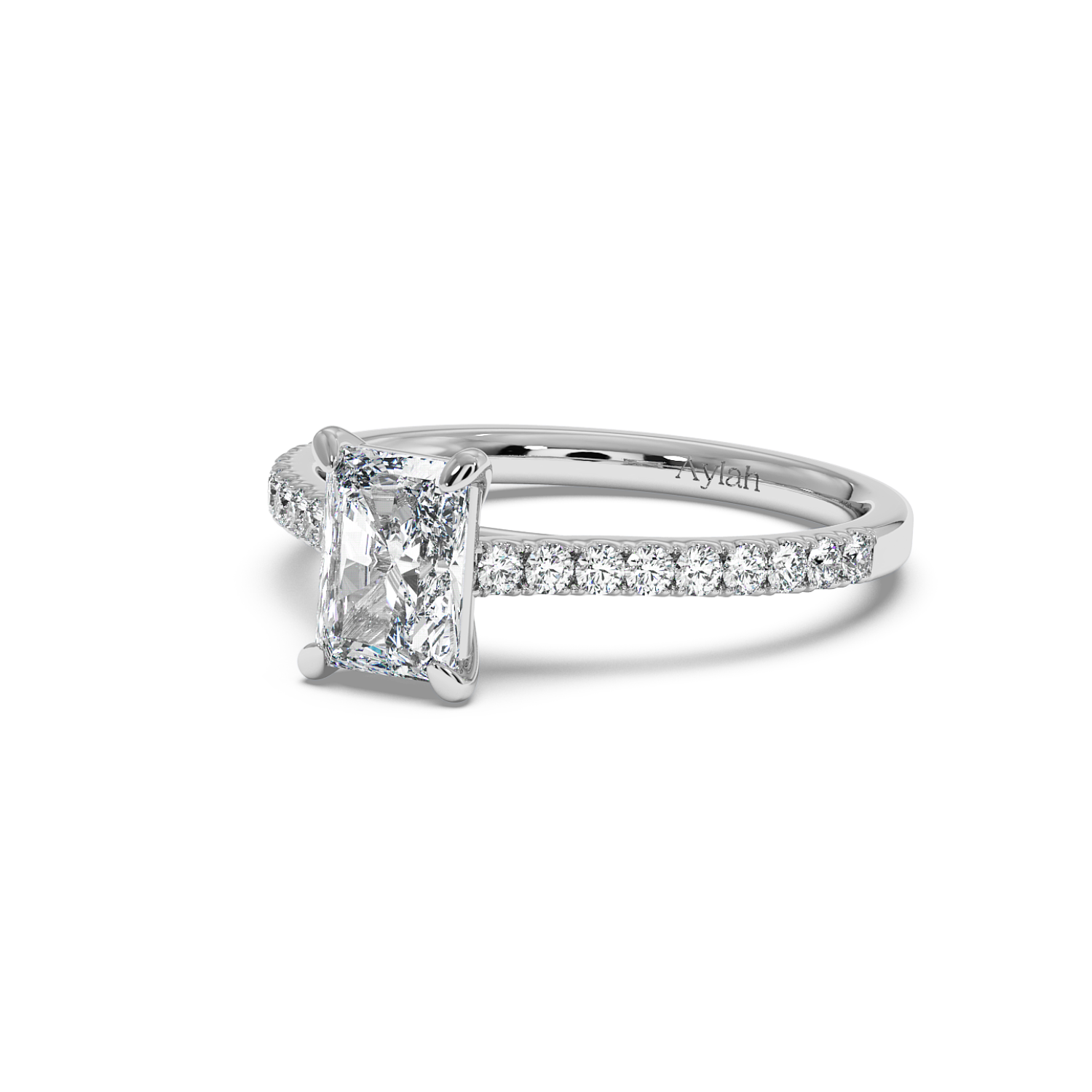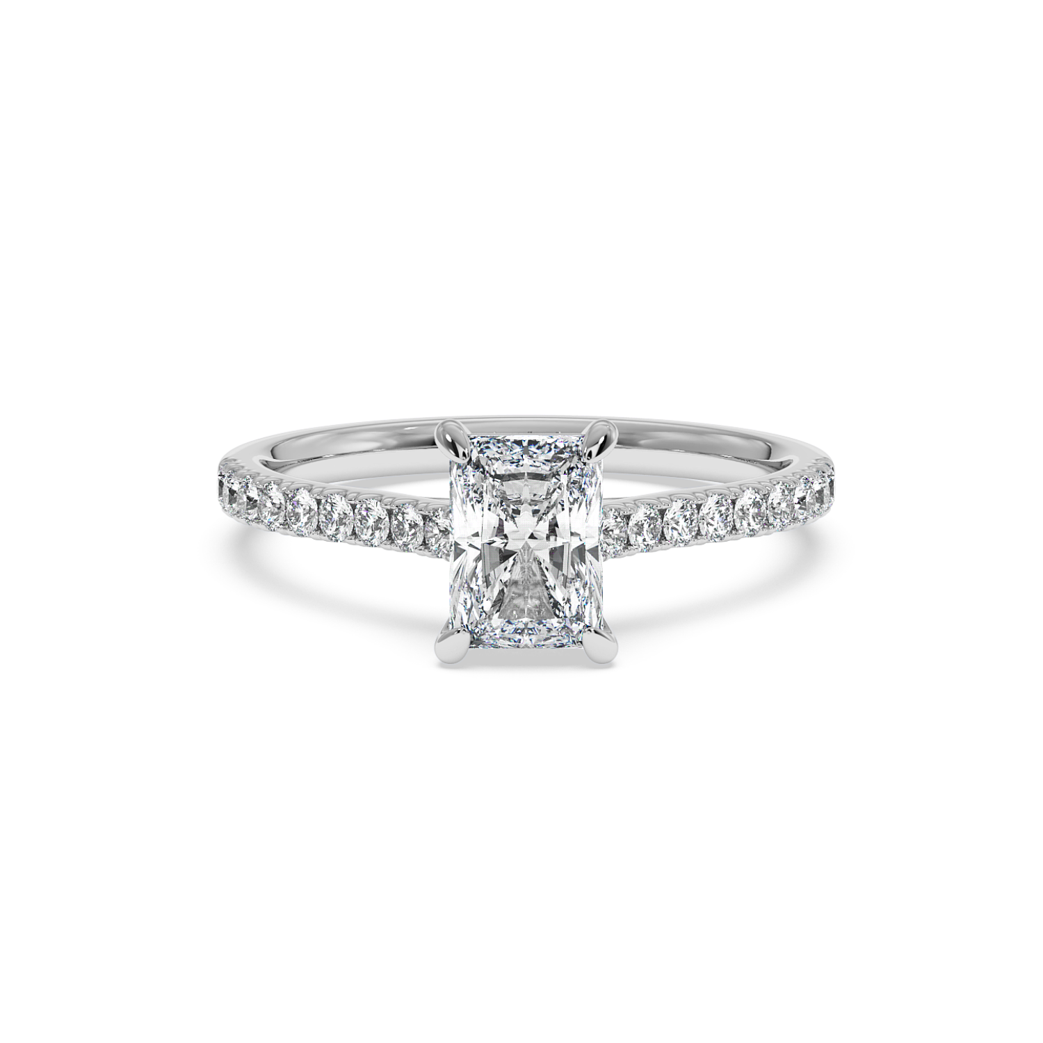 Classic 4 Claw Radiant Diamond Ring, With Micro Set Shoulder Diamonds Halfway (Uniform Width)
