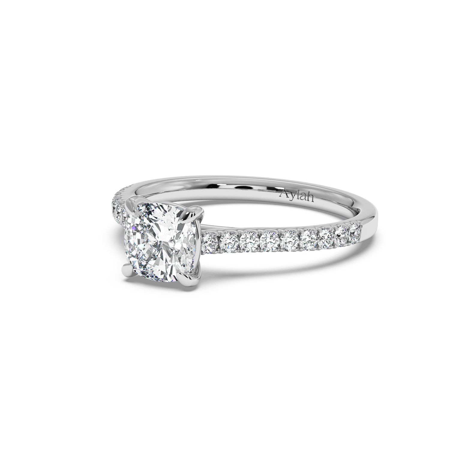 Classic 4 Claw Cushion Diamond Ring, With Micro Set Shoulder Diamonds Halfway (Uniform Width)
